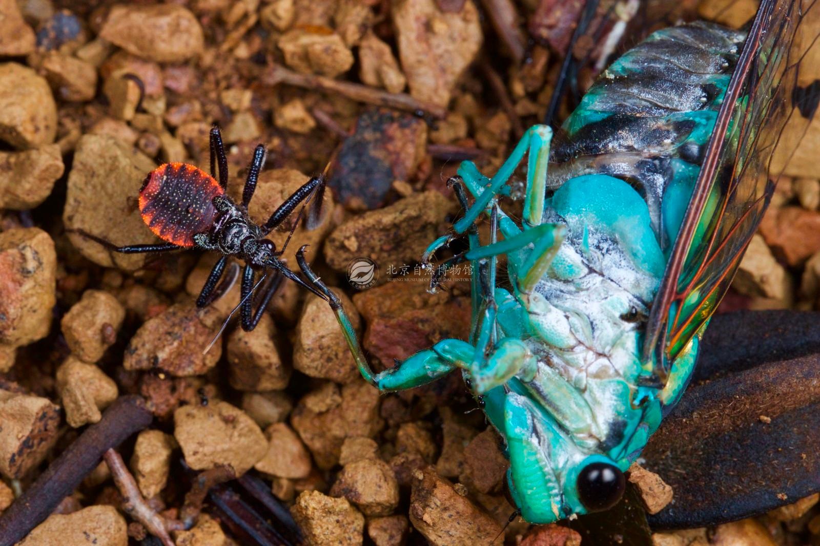 猎蝽若虫在地面上寻找到一只蝉的尸体,从蝉的颜色来看,这只蝉刚刚死去不久,猎蝽若虫伸出刺吸式口器,选择了最细弱的一个结构:蝉的一条伸出的前足,在蝉坚硬的外骨骼构成的关节间,猎蝽若虫找到最软弱的节间膜地带,刺入口器,吸食蝉的身体。