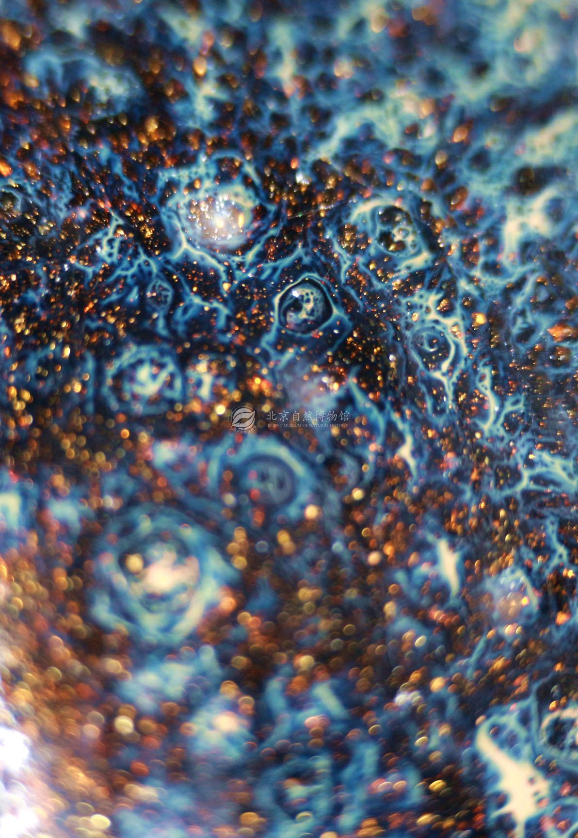 此作品用显微摄影展现了一只宋代建盏的盏底景象,画面中黄色像恒星的发光体为长石结晶,蓝色像星云的物质为四氧化三铁在高温下的气泡中形成的结晶,这两种物质绝妙的搭配形成了类似宇宙星空的图像。