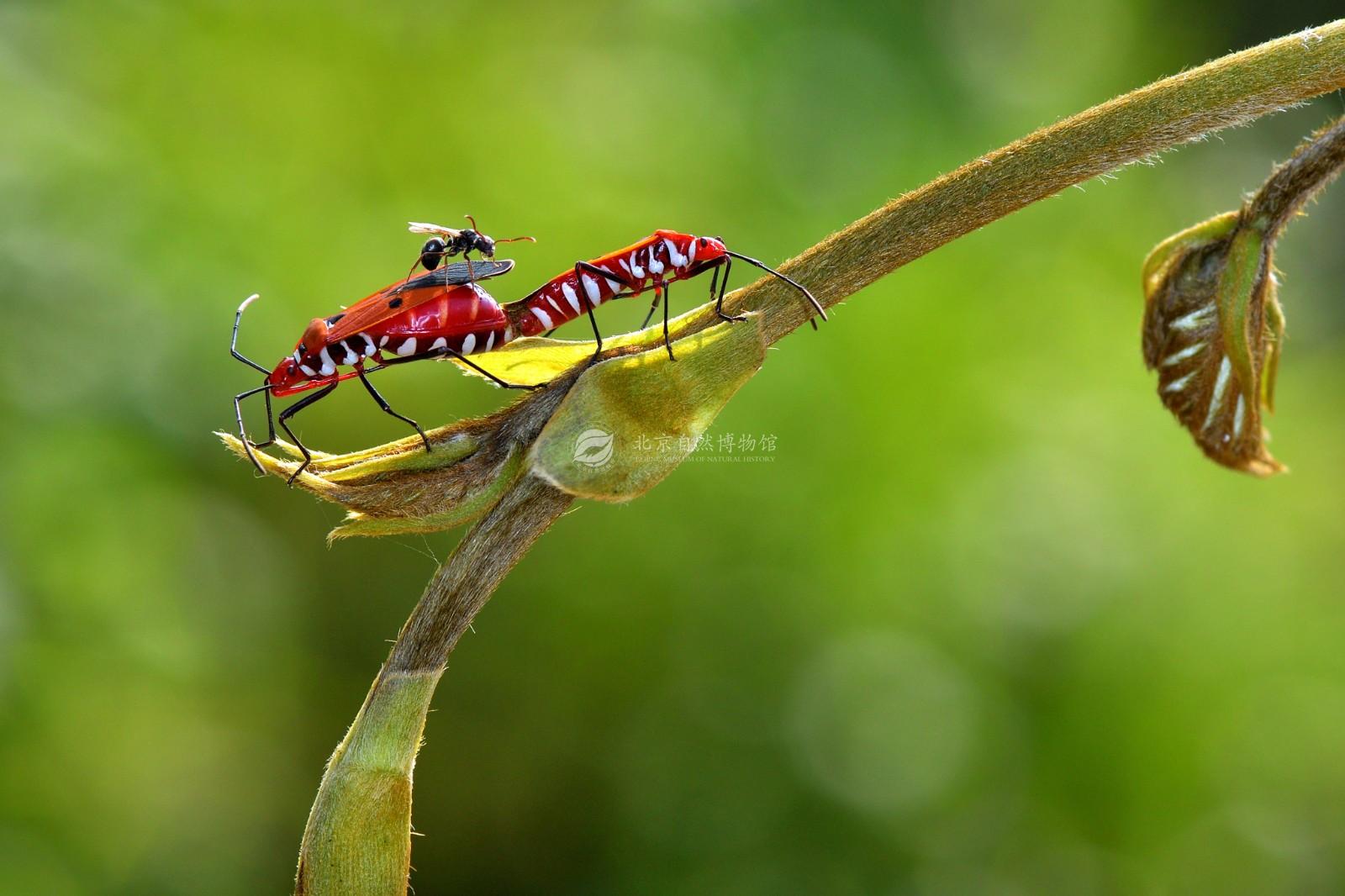 赤星椿象(Dysdercuscingulatus)交尾,左邊為雌蟲,右邊為雄蟲,腹面側緣有紅、白色相間的條紋,顏色非常漂亮,兩蟲正當翻雲覆雨忘我的境界,一隻好奇的螞蟻,在牠們背上逛來逛去,不時探頭張望,形成一副有趣的景象。