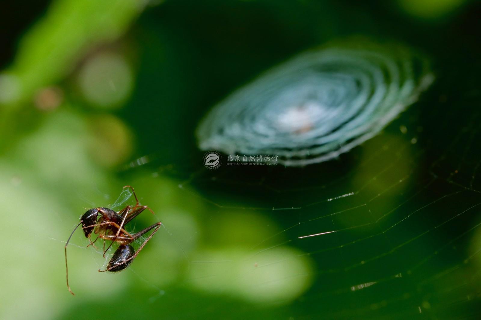 蜘蛛靠著結網,成為了一群優秀的捕食者,路過的小型昆蟲只要誤入網中,往往只能垂死掙扎,最終成為蜘蛛今日的佳餚。照片中的螞蟻才剛陷入其中,他或許無法究受這樣的命運,試著擺動自己的六足希望能順利脫逃,但這只是讓他的腳被更多的蜘蛛絲纏繞,也更快讓蜘蛛注意到他的存在,加速自己的滅亡。