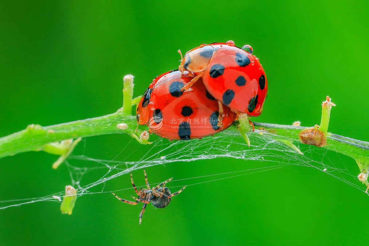 創作理念:用鏡頭記錄家鄉生態 小十三星瓢蟲 體長約 6~9.5 mm,體背為橙黃色至橙紅色,前胸背板下緣的中央有一個雙峰型的黑色斑紋,小盾板為黑色,鞘翅為橙紅色,翅上共有13個黑色圓斑,個體間的差異,除蟲體背部底色外,黑色斑紋的變化極小。低海拔地區常見,肉食性昆蟲,成蟲、幼蟲皆以蚜蟲為食,是農民的好朋友。 這對恩愛的小十三星瓢蟲正努力完成傳宗接代的任務,下面那知鬼蛛當個不識相的偷窺者,也許牠正虎視眈眈地在覬覦這可口的食物。