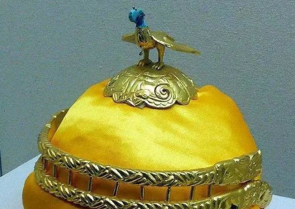 匈奴王冠,该金冠于1972年鄂尔多斯市杭锦旗出土,纯金制造,重1394克,金冠由金鹰和冠带两部分组成。